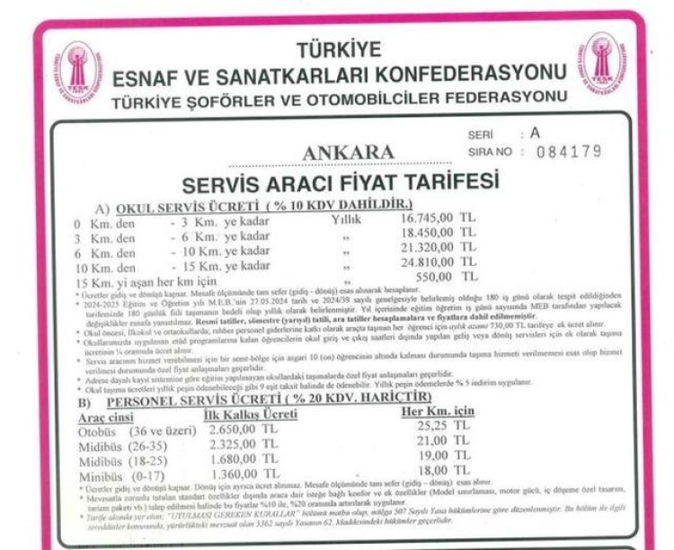 Buna göre okul servis ücreti yıllık 0-3 km arası 16 bin 745 TL, 3-6 km arası 18 bin 450 TL, 6-10 km 21 bin 320 TL, 10 -15 km arası ise 24 bin 810 TL oldu.