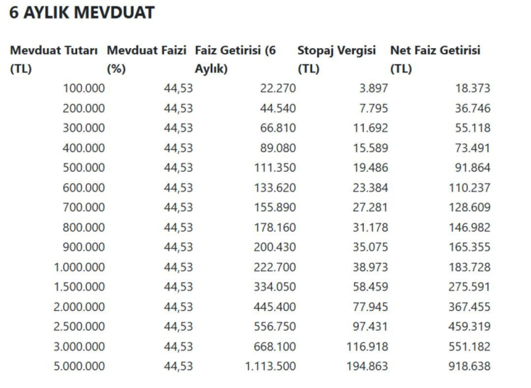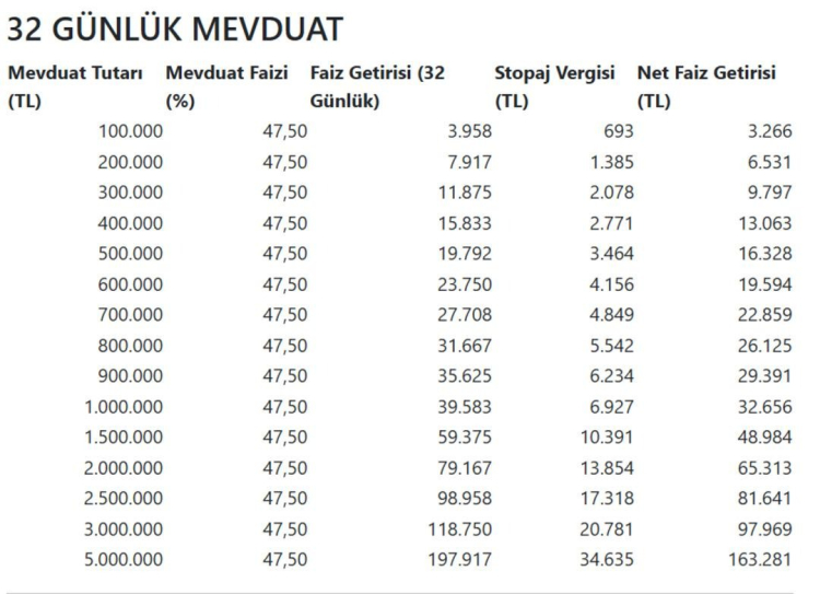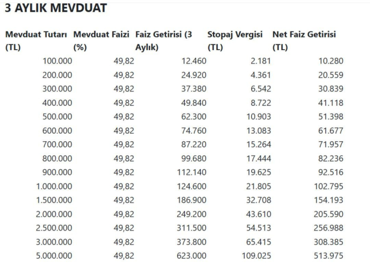 100 bin lirasını 1 aylık mevduatta değerlendirmek isteyen bir mevduat sahibinin faiz getirisi net olarak 3.266 lira oluyor.