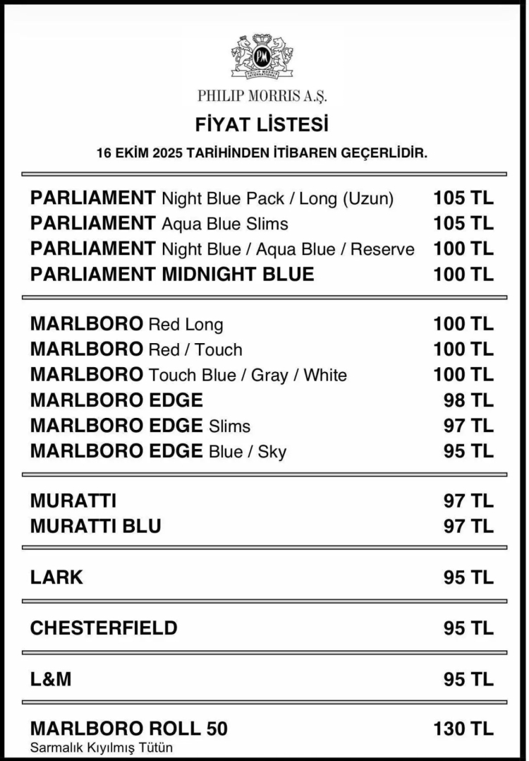 Philip Morris A.Ş., sigara fiyatlarına bir kez daha zam yaptı. Şirketin yeni fiyat listesi 16 Ekim 2025 tarihinden itibaren geçerli olacak.