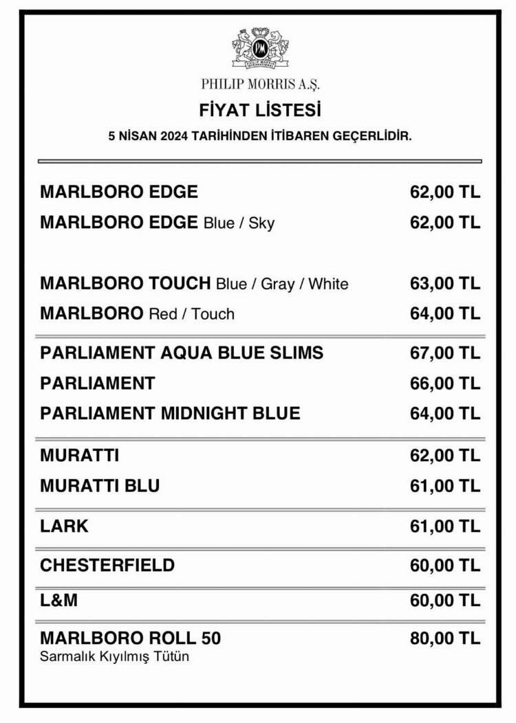 5 Nisan 2024 tarihinden itibaren geçerli olmak üzere Philip Morris grubu sigaralara zam geldi.