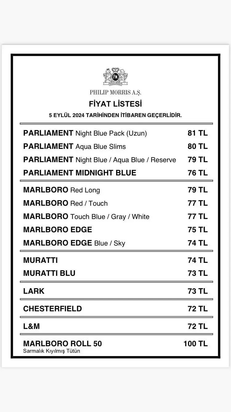 Zamlı sigara fiyatları listesine göre, sigara grubunda fiyatlar 3-4 TL arttı. PM sigara grubuna zam bugünden itibaren geçerli olacak.