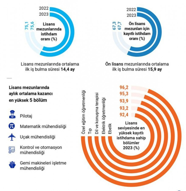 Lisansta en yüksek istihdama sahip bölümler ve yüzdelik dilimleri TÜİK'e göre özel eğitim öğretmenliği (96.2), tıp (95.3), dil ve konuşma terapisi (93.9), elektrik öğretmenliği (93.2), ebelik (92.4) oldu. En hızlı iş bulanlar ise 2.3 ay ile dil ve konuşma terapistleriyle 4.2 ay ile doktorlar ve 7.3 ay ile ebeler.