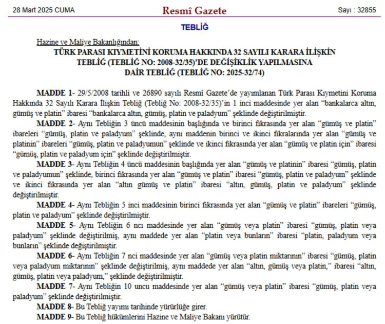 Ayrıca, tebliğin çeşitli maddelerinde yer alan “gümüş ve platin” ibareleri “gümüş, platin ve paladyum” şeklinde güncellendi. Böylece, altın, gümüş ve platinle birlikte paladyum da finansal işlemlerde daha geniş kapsamda değerlendirilebilecek.