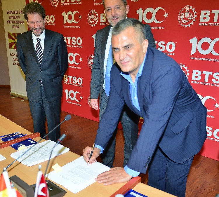 Şahterm Grup Ceo'su ve Yönetim Kurulu Başkanı Faruk Şahin, BTSO'da gerçekleşen Kuzey Makedonya İş Forumu'nda ülkeye yapacakları toplam 100 milyon euro'luk yeni fabrika yatırımı sözleşmesini, Kuzey Makedonya Türkiye Büyükelçisi Jovan Manasijevski ve Teknolojik Endüstriyel Geliştirme Bölgeleri Müdürlüğü Direktörü Jovan Despotovski ile birlikte imzaladı.