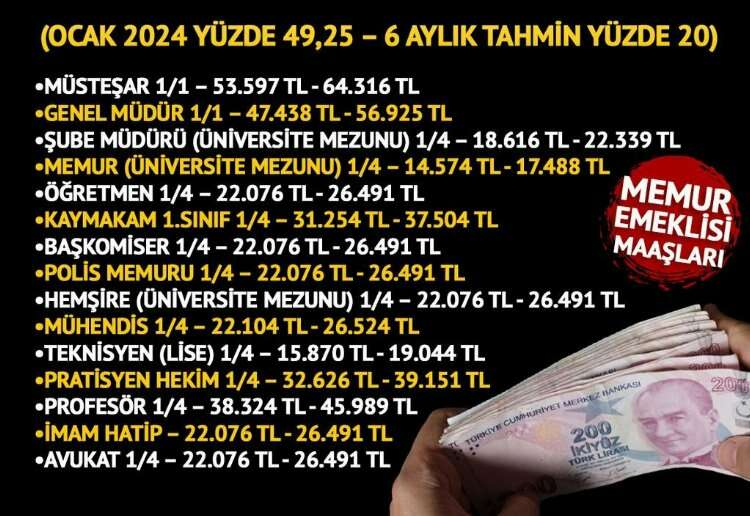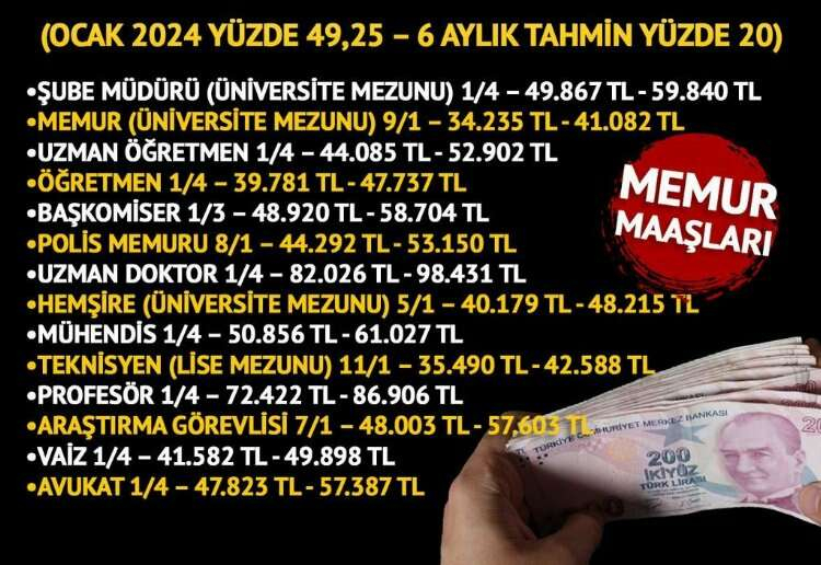 Ocak 2024’te yüzde 49,25'lik memur zammı sonrası en düşük memur maaşı 32.860 TL’ye yükselmişti. En düşük memur emeklisi maaşı ise 9 bin 876 liradan 14 bin 741 liraya çıkmıştı. 6 aylık enflasyon tahmini baz alındığında en düşük memur maaşı yüzde 20’lik zam ile 39.432 liraya ulaşacak. Memur emeklisi için bu rakam 17.689’ye yükselecek.