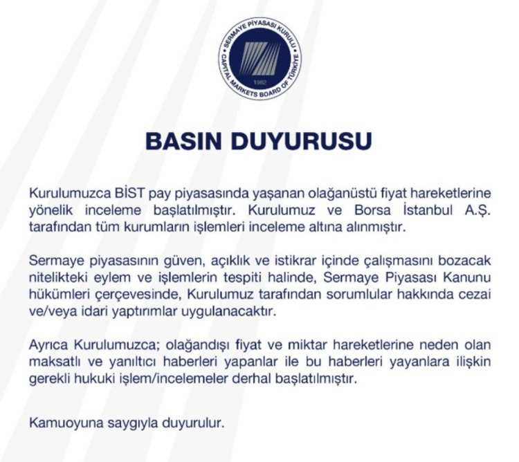 "Kurulumuzca BİST pay piyasasında yaşanan olağanüstü fiyat hareketlerine yönelik inceleme başlatılmıştır. Kurulumuz ve Borsa İstanbul A.Ş. tarafından tüm kurumların işlemleri inceleme altına alınmıştır.