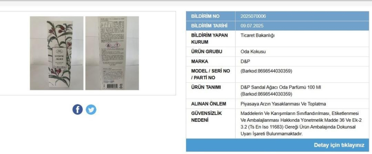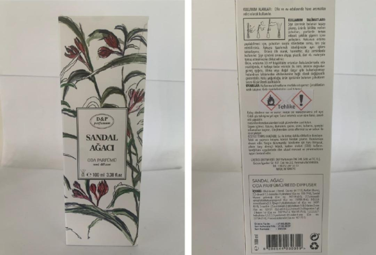 Listede yer alan bir diğer ürün ise D&P markasına ait Sandal Ağacı Oda Parfümü 100 ml oldu. Ürünün ambalajında gerekli dokunsal uyarı işaretlerinin bulunmaması nedeniyle güvensizlik kararı verildi.