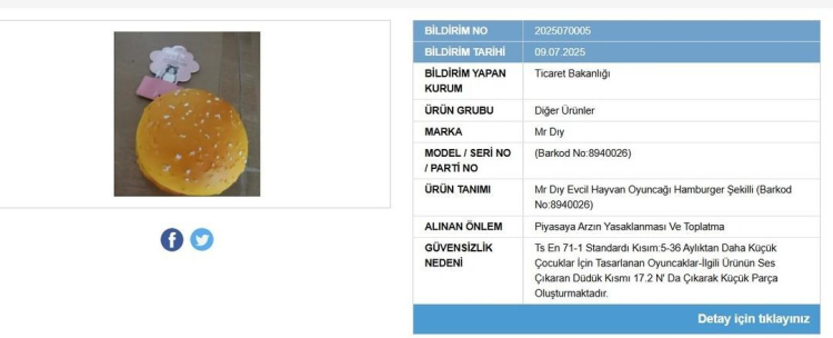 Mr DIY markasına ait hamburger şekilli evcil hayvan oyuncağı da güvenli bulunmadı. Ürünün, küçük parça oluşturması nedeniyle küçük çocuklar için ciddi risk taşıdığı belirtildi.