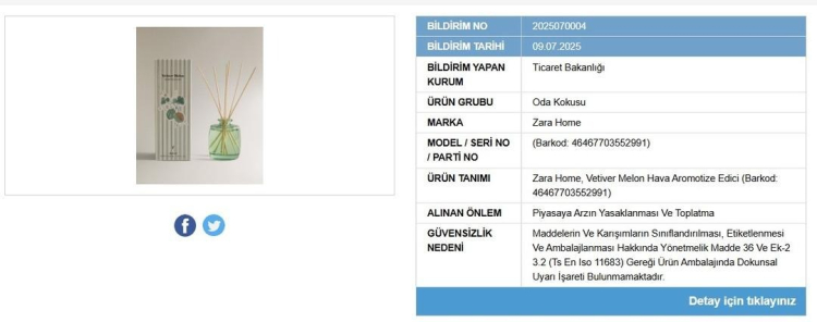 Zara Home markasına ait Vetiver Melon hava aromatize edici ürün de güvensiz ürünler arasında yer aldı.