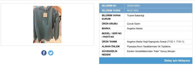 Uygulanan işlem: Ürünün piyasaya arzı yasaklandı ve toplatılmasına karar verildi