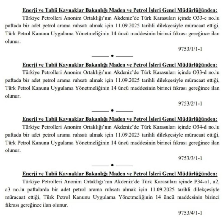 NTV'de yer alan habere göre TPAO, 033-c, 033-d, 034-d ve P34-a1, a2, a3 numaralı paftalarda petrol arama ruhsatı almak üzere müracaatlarını tamamladı. Bu alanlar Mersin ve Adana açıklarında yer alıyor.