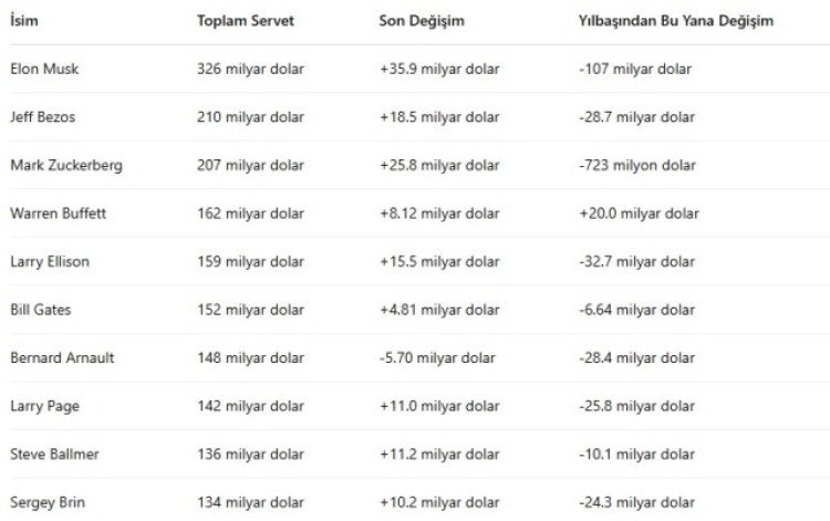 Dünyanın en zengin 10 kişisinin servetine bir günde 135,33 milyar dolar eklendi. Elon Musk, 35,9 milyar dolarlık artışla en büyük günlük kazancı elde etti.