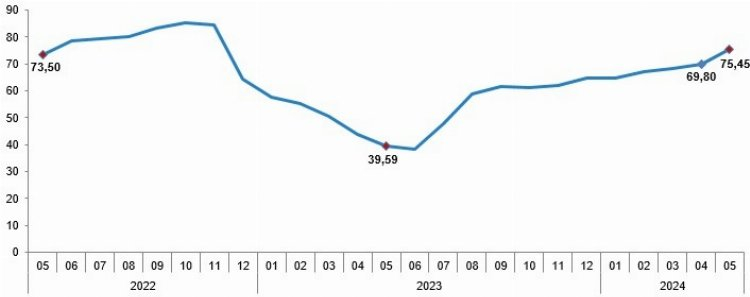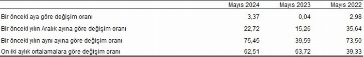 TÜFE'deki (2003=100) değişim 2024 yılı Mayıs ayında bir önceki aya göre yüzde 3,37, bir önceki yılın Aralık ayına göre yüzde 22,72, bir önceki yılın aynı ayına göre yüzde 75,45 ve on iki aylık ortalamalara göre yüzde 62,51 olarak gerçekleşti.