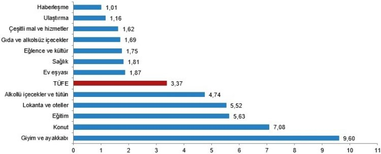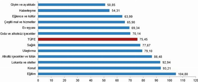 Bir önceki yılın aynı ayına göre en az artış gösteren ana grup yüzde 50,85 ile giyim ve ayakkabı oldu. Buna karşılık, bir önceki yılın aynı ayına göre artışın en yüksek olduğu ana grup ise yüzde 104,80 ile eğitim oldu.
