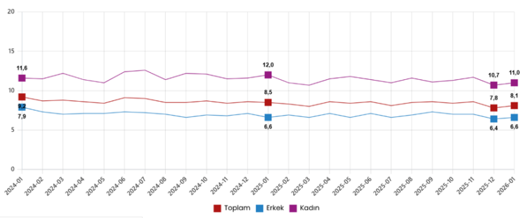 Türkiye İstatistik Kurumu’nun (TÜİK) açıkladığı Hanehalkı İşgücü Araştırması sonuçlarına göre, mevsim etkisinden arındırılmış işsizlik oranı Ocak 2026’da bir önceki aya göre 0,3 puan artarak yüzde 8,1 oldu.