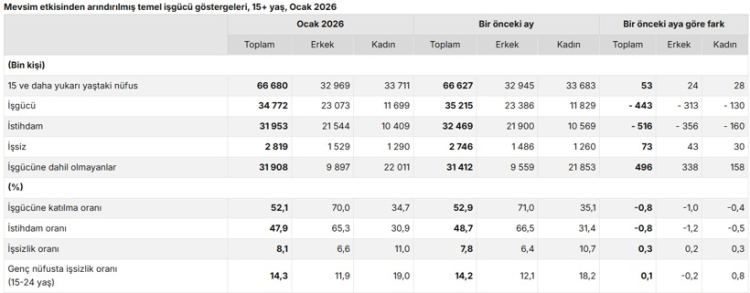 TÜİK’in Ocak 2026 İşgücü İstatistikleri’ne göre işsizlik oranı yüzde 8,1’e çıktı. İstihdam 516 bin kişi azalırken, atıl işgücü oranı yüzde 29,9’a yükseldi. Genç işsizlik yüzde 14,3 olurken kadınlardaki işsizlik oranı yüzde 11 seviyesinde gerçekleşti.