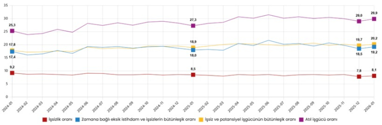 Zamana bağlı eksik istihdam, potansiyel işgücü ve işsizleri kapsayan atıl işgücü oranı Ocak ayında 0,9 puan artarak yüzde 29,9 oldu. Zamana bağlı eksik istihdam ve işsizlerin bütünleşik oranı yüzde 19,2, işsiz ve potansiyel işgücünün bütünleşik oranı ise yüzde 20,2 olarak hesaplandı.