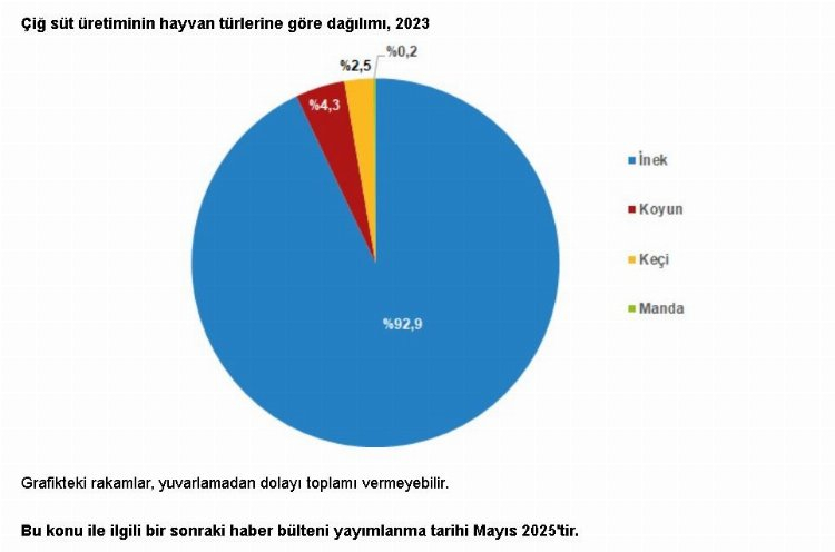 2022 yılında 21 milyon 563 bin 492 ton olan çiğ süt üretimi, 2023 yılında yüzde 0,4 azalarak 21 milyon 481 bin 567 ton oldu. Bir önceki yıla göre, keçi sütü üretimi yüzde 0,5, inek sütü üretimi yüzde 0,2 artarken; koyun sütü üretimi yüzde 12,5 ve manda sütü üretimi yüzde 1,3 azaldı. 2023'te çiğ süt üretiminin yüzde 92,9'unu inek sütü, yüzde 4,3'ünü koyun sütü, yüzde 2,5'ini keçi sütü ve yüzde 0,2'sini manda sütü oluşturdu