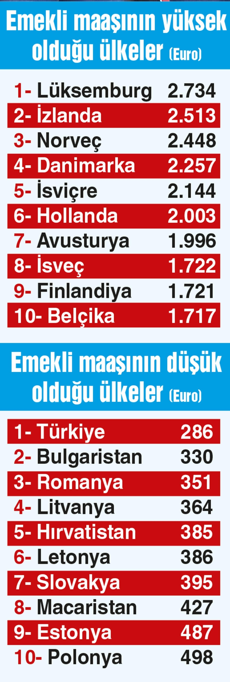 En düşük emekli maaşına yapılacak olan zammın konuşulduğu bu günlerde Türkiye, Avrupa sıralamasında sondaki yerini koruyor. 286 Euro’luk emekli maaşı ile Avrupa ülkeleri arasında son sırada bulunan Türkiye, Avrupa’da enflasyonun en yüksek olduğu ülke konumunda.