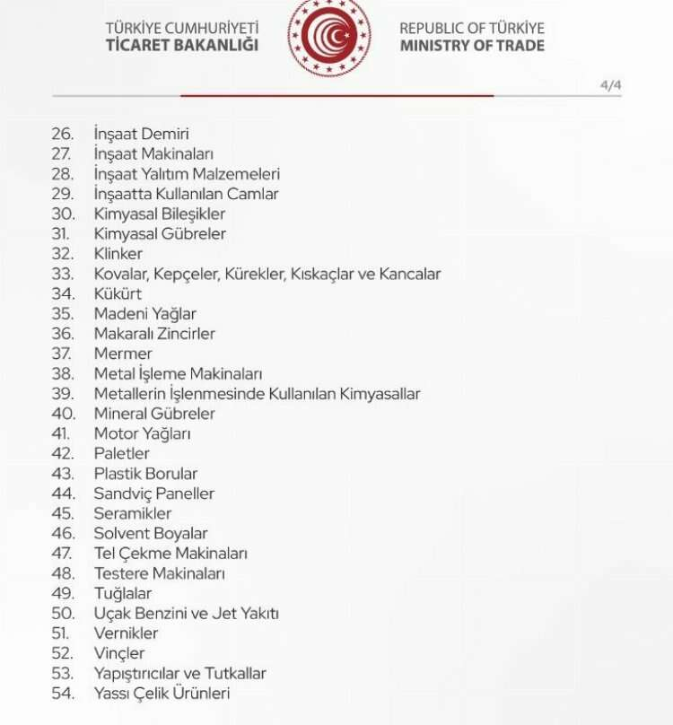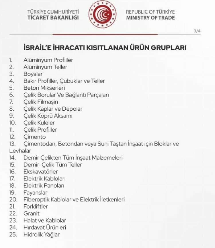 ürün grupları altında yer alan ürünlerin İsrail’e ihracatını kısıtlama kararı almış bulunmaktadır. Bu kararın gerekleri Ticaret Bakanlığı tarafından derhal yürütülecektir.