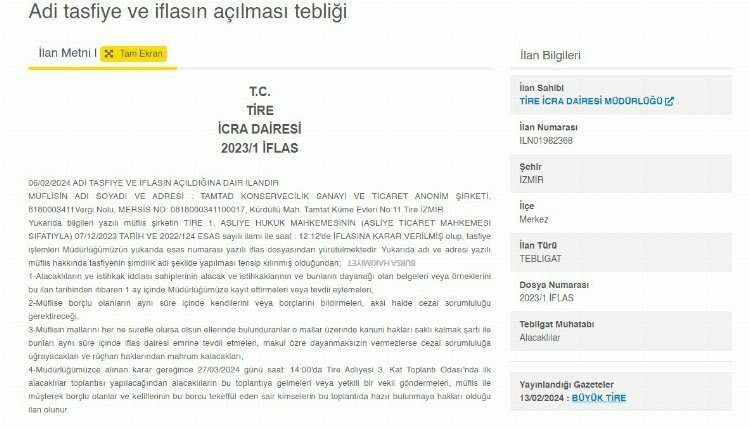 Tire İcra Dairesi Müdürlüğü, İzmir'de faaliyet gösteren Tamtad Konservecilik Sanayi Ve Ticaret Anonim Şirketi adlı şirketin iflasına karar verildiğini açıkladı.