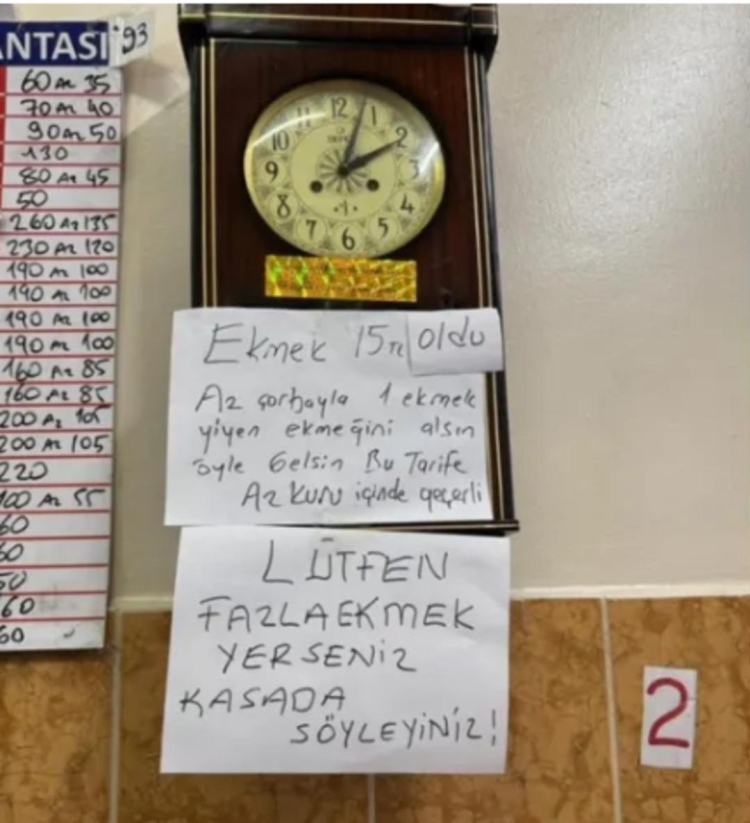 Ekonomik sıkıntı yaşayan esnaf lokantaları, karnını doyurmak için bir kase çorba yanında bolca ekmek yiyen müşterisine yazılı uyarıda bulundu. İzmit'te bir esnaf lokantasının, çorba yanında verilen ekmeğe getirdiği yeni düzenleme sosyal medyada dikkat çekti. Artık ekmeğin 15 TL olduğu belirtilen lokantada, duvara asılan yazı gündem oldu.