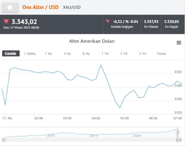 Ons altın ise 3357 dolar ile en yüksek seviyesini gördü. Ons altın sabah saatlerinde ise 3342 dolar seviyelerinde seyrediyor.