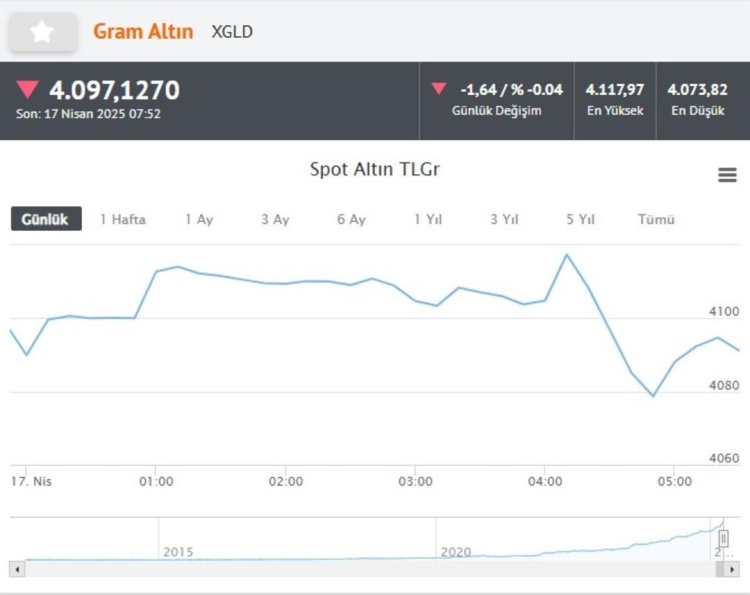 Gram altın 4117 TL ile en yüksek seviyesini test etti. Gram altın sabah saatlerinde 4096 TL seviyesinde seyrediyor.