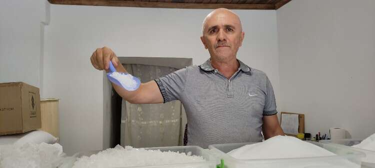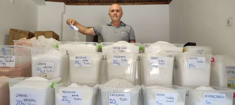 İşlenmemiş kaya tuzlarının sağlık açısından çok faydalı olduğunu ifade eden Emin Esen, "10 çeşit tuz satışı yapmaktayım. Her tuzun farklı özelliği var kiminin demiri yüksek kiminin ise minareli işlenmemiş tuzlar zararsız doğal tuzlar tansiyonu çıkartmaz.