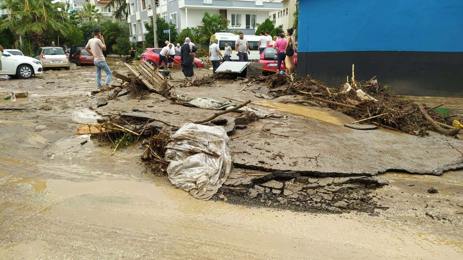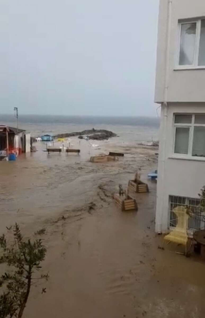 Halitpaşa Mahallesi'nde sel suları sebebiyle karayla deniz birleşti.