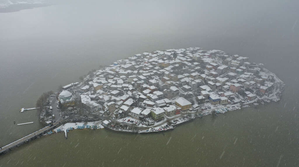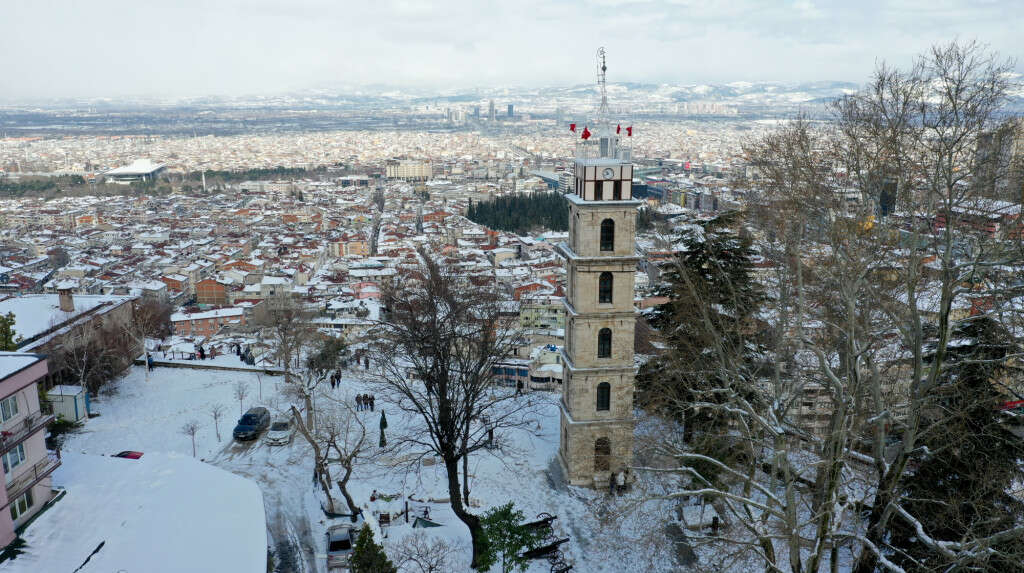 Bursa Büyükşehir Belediyesince çekilen görüntülerde, karın beyazlığının kentin tarihi yapılarına ayrı bir güzellik kattığı görülüyor.
