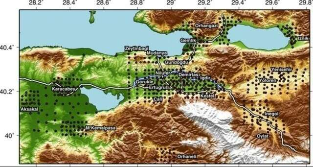 Haritaya göre; Bursa'da, Osmangazi, Yıldırım ve Nilüfer gibi nüfus yoğunluğunun yüksek olduğu bölgeler birinci derece deprem riski taşıyor.