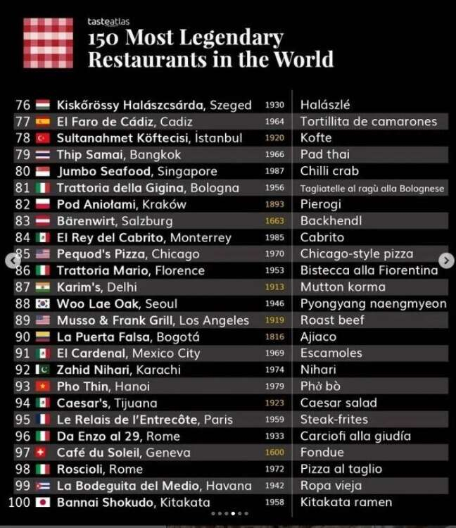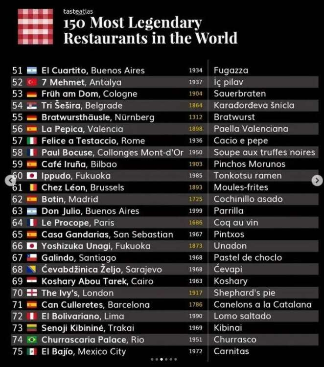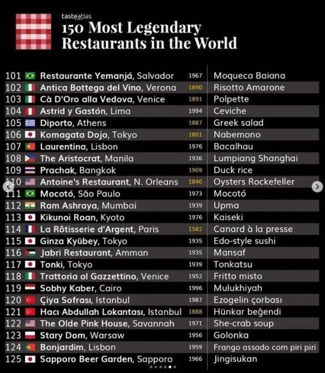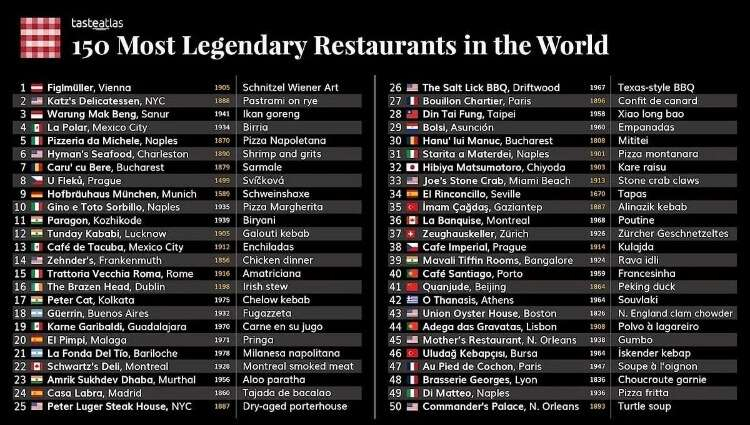 TasteAtlas geçtiğimiz günlerde dünyanın en efsanevi 150 restoranı ve bu restoranların ikonik yemeklerini paylaştı.