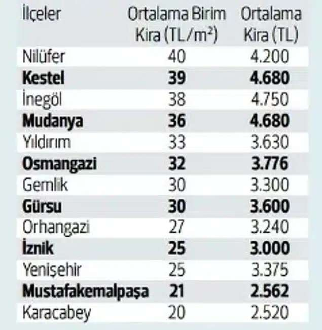 BURSA Bursa'da Ekim 2022 sonu itibarıyla konut kiraları yüzde 91,04 oranında artarak, ortalamada asgari ücretin altında kalan tek il olup 3,974 TL ‘de kaldı. Doğal olarak bu da kiralık konutlarda geri dönüş yani amortisman süresini uzattı ve 28 yıl seviyesinde oluştu. Yıllık ortalamalarda Bursa’da en fazla değer kazanan ilçeler merkez dışında kalarak, Kestel, Gürsu, Yıldırım, Orhangazi, Gemlik oldu.