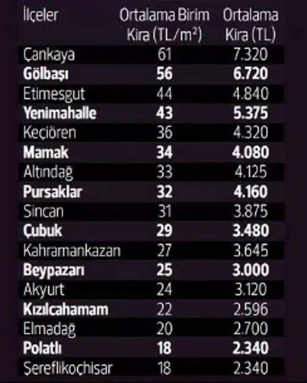 ANKARA Ankara’da konut kiraları yüzde 163,43 oranında arttı. Ortalama kiralar 5.466 TL olurken, Ortalama konut büyüklüğü 125 metrekare ile metrekareye 44 TL ödeniyor. Kiralık konutlarda geri dönüş süresi ortalama 18 yıl olurken, yıllık ortalamalarda en fazla değer kazanan ilçeler de Sincan, Mamak, Keçiören, Çubuk, Akyurt oldu.