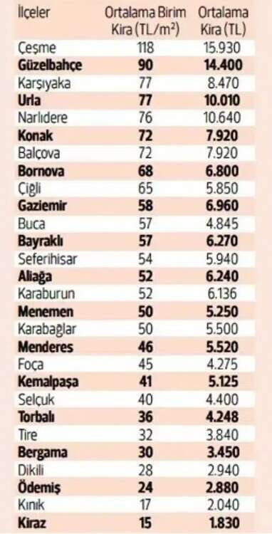 İZMİR İzmir’de Ekim 2022 sonu itibarıyla konut kiraları yıllık yüzde 153,70 oranında arttığı görülüyor. Ortalama kiralar 6.932 TL olurken, metrekareye 63 TL bir fiyat biçiliyor. Yatırımlık konut alanlar içinde kiralık konutların geri dönüş süreleri 22 yıl seviyesinde oluyor. Yıllık ortalamalarda İzmir’de en fazla değer kazanan ilçeler Bayraklı, Konak, Karşıyaka, Buca, Bornova oluyor.