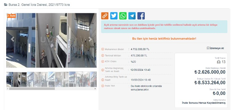 Muhammen Bedel: 4 milyon 752 bin TL Verilen En Yüksek Teklif: 8 milyon 533 bin 264 TL