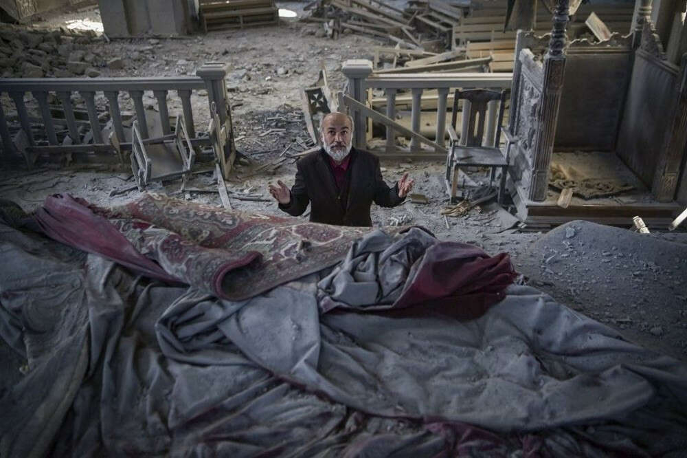 Karabağ'da harap olmuş kilisede dua eden bir Ermeni
