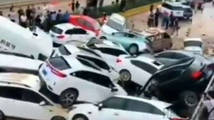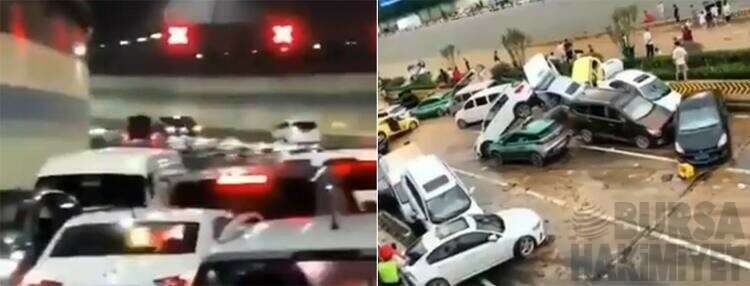 Zhengzhou'daki bir tünelde yüzlerce araç seyir halindeyken sele yakalandı. Sosyal medyada yayınlanan görüntülerde selin ardından yüzlerce aracın üst üste yığıldığı görüldü.