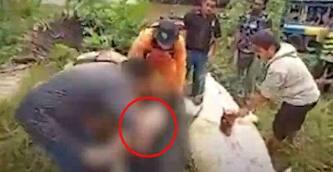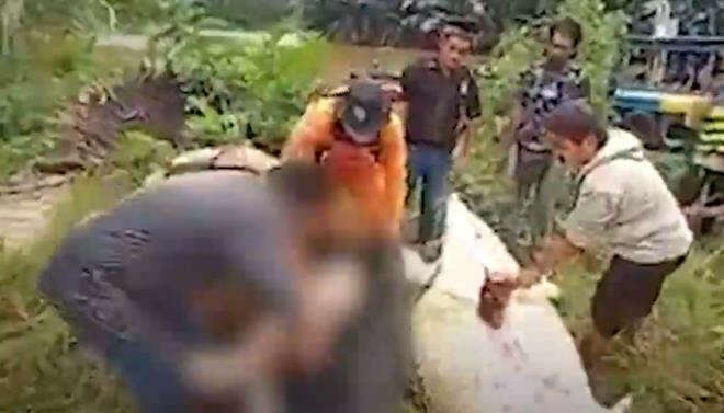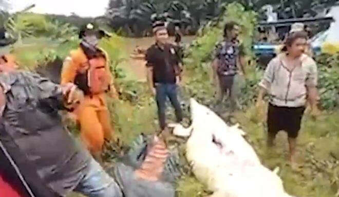 Kutai Timur bölgesindeki yerliler ertesi gün altı metrelik timsahı yakaladı ve içinde çocuğun cansız bedenini hayvanın karnını yarıp çıkardılar.