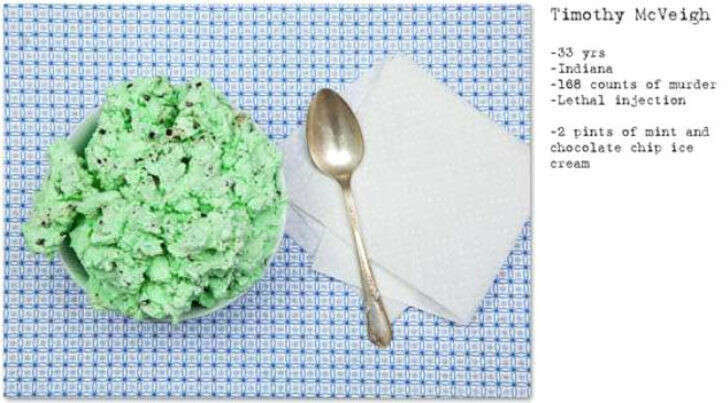 Timothy McVeigh: 33 Yaşında, Indiana'lı. 168 kişinin ölümünden sorumlu bulunup zehirli iğne ile idama mahkum edilmiş. Son akşam yemeği isteği 2 kap naneli ve çikolata parçalı dondurma olmuş.