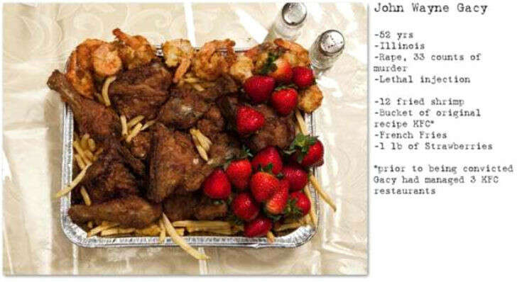 John Wayne Gacy: Gacy 52 Yaşında, Illinois'li. Tecavüz ve 33 kişiyi öldürmekten zehirli iğne ile idama mahkum edilmiş. Son akşam yemeği isteği 12 kızarmış karides, KFC'den bir kova, patates kızartması ve çilek olmuş. Bu arada Gacy yakalanmadan önce KFC restoranında yönetici olarak çalışmış.