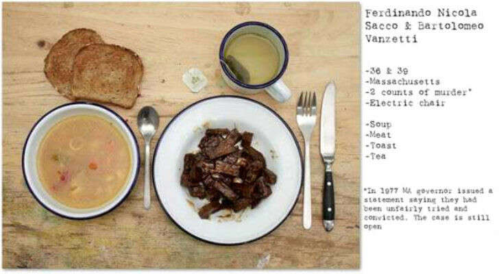 Ferdinando Nicola Sacco ve Bartolomeo Vanzetti: Ferdinando 36, Bartolomeo 39 yaşında. Masachusetts'lılar. 2 Cinayet suçlaması ile elektrikli sandalyede idam edilmişler. Son akşam yemeği istekleri çorba, Et, Tost ekmeği ve çay olmuş. İdam edildikten sonra vali tarafından yanlış suçlamayla idam edildikleri açıklanmış. Dosya hala açık, asıl suçlular hiçbir zaman bulunamamış.