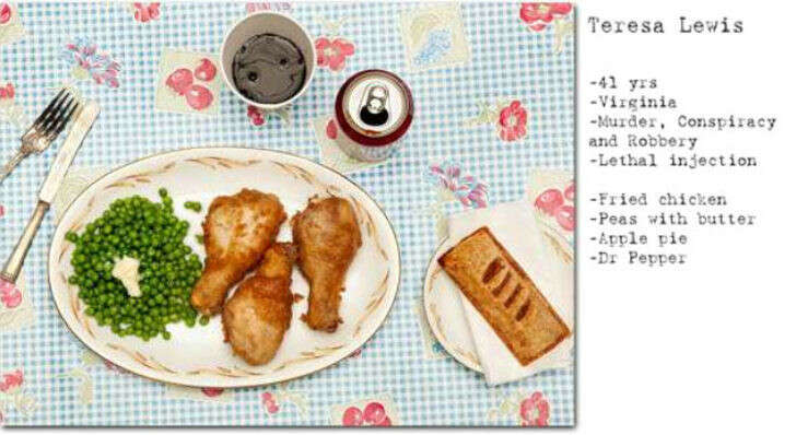 Teresa Lewis: 41 Yaşında, Virginia'lı. Cinayet, soygun ve komplodan zehirli iğne ile idama mahkum edilmiş. Son akşam yemeği isteği kızarmış tavuk, tereyağlı bezelye, elmalı pasta ve kola olmuş.