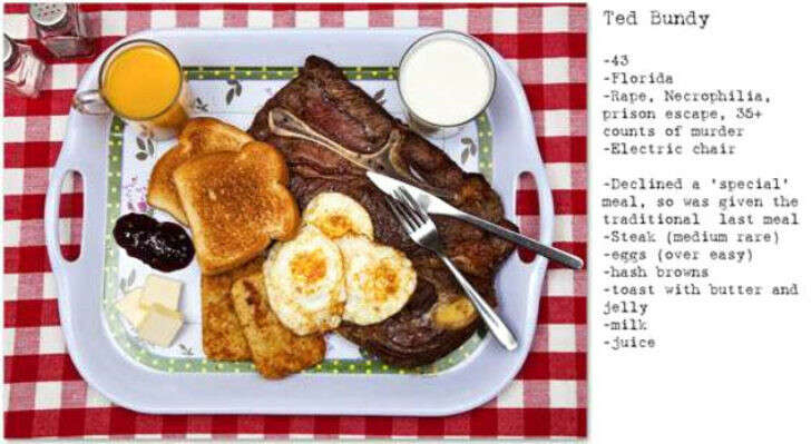 Ted Bundy: 43 yaşında, Florida'lı. Tecavüz, Nekrofili, Hapishaneden Kaçış ve 35 Cinayet suçuyla elektrikli sandalyede idama mahkum edilmiş. Özel bir yemeği reddetmiş. Bu yüzden herkese verilen standart son yemek kendisine verilmiş: Orta-az pişmiş et, yumurta, kızarmış ekmek, reçel, süt, meyve suyu.