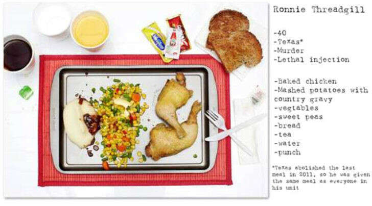 Ronnie Threadgill: 40 yaşında, Texas'lı. Cinayet suçundan zehirli iğne ile idam edilmiş. Son akşam yemeği isteği haşlanmış tavuk, soslu patates püresi, sebzeler, ekmek, çay, su ve panç olmuş.