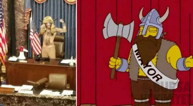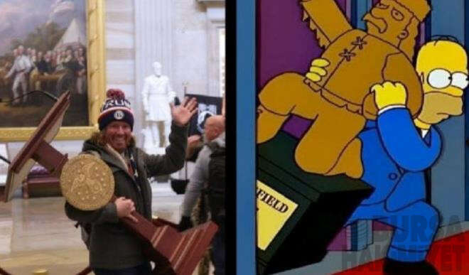 Sosyal medyada en çok paylaşılan görsellerden bir diğeri de Kongre binasına giren yağmacılardan kürsü çalan adamın fotoğrafı ile Homer Sipmson'ın heykel çaldığı sahneden bir kare oldu.