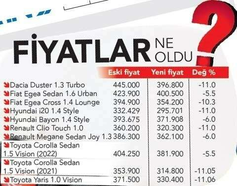 OTOMOBİL FİYATLARINDA 48 BİN TL'YE VARAN İNDİRİM Yeni düzenleme sonrasında Toyota Corolla 1.5 Vision modelinin fiyatı yüzde 5.5 düşüşle 404 bin 250 TL'den 381 bin 900 TL'ye inecek. Corolla'daki indirim 23 bin 350 TL seviyesinde gerçekleşecek. Toyota Yaris 1.0 Vision versiyonundaki indirim 41 bin 100 TL oldu. Fiat Egea'nın fiyatlarında yüzde 5.5 ila 10.3 arasında indirim oldu. Renault Clio Touch 1.0 modelinin fiyatı 39 bin 900 TL düşüşle 320 bin 300 TL'ye, Megane Sedan 1.3 Joy modelinin fiyatı ise 24 bin 200 TL düşüşle 362 bin 100 TL'ye indi. Hyundai i20 1.4 Style modelinin satış fiyatı düzenleme sonrasında 36 bin 728 TL düştü.