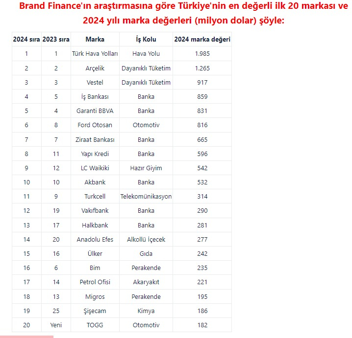 Bu kapsamda, 1 milyar 985 milyon dolarlık marka değeriyle THY, Türkiye'nin en değerli markası olmayı sürdürdü. THY, 5 yıldır zirvedeki yerini korurken ikinci sırada 1 milyar 265 milyon dolarla Arçelik, üçüncü sırada 917 milyon dolarla Vestel yer aldı.