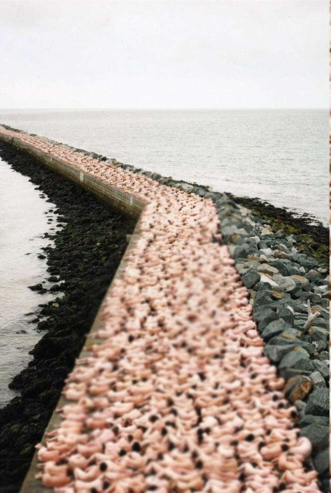 Spencer Tunick, 1999 ve 2001 yılları arasında mahkemede iki yıl mücadele verdikten sonra New York'un kamusal alanlarında nü fotoğraf çekimleri yapabilmek için izin aldı. 2001 yılının Mayıs ayında Musée d'art contemporain de Montréal önünde 2.500 ila 3.000 kişilik bir grubun çıplak fotoğraflarını çekti. Tunick'in bu çalışması çok önemliydi, çünkü yaptığı şeyin sadece çıplak insan fotoğraflarından ibaret olmadığını göstermek istiyordu. Başarılı da oldu ve tartışmalı çalışmaları birer sanat eseri olarak görülmeye başlandı. Daha sonra Eylül 2001 yılında Londra'da 400 çıplak gönüllünün fotoğrafını çekti.